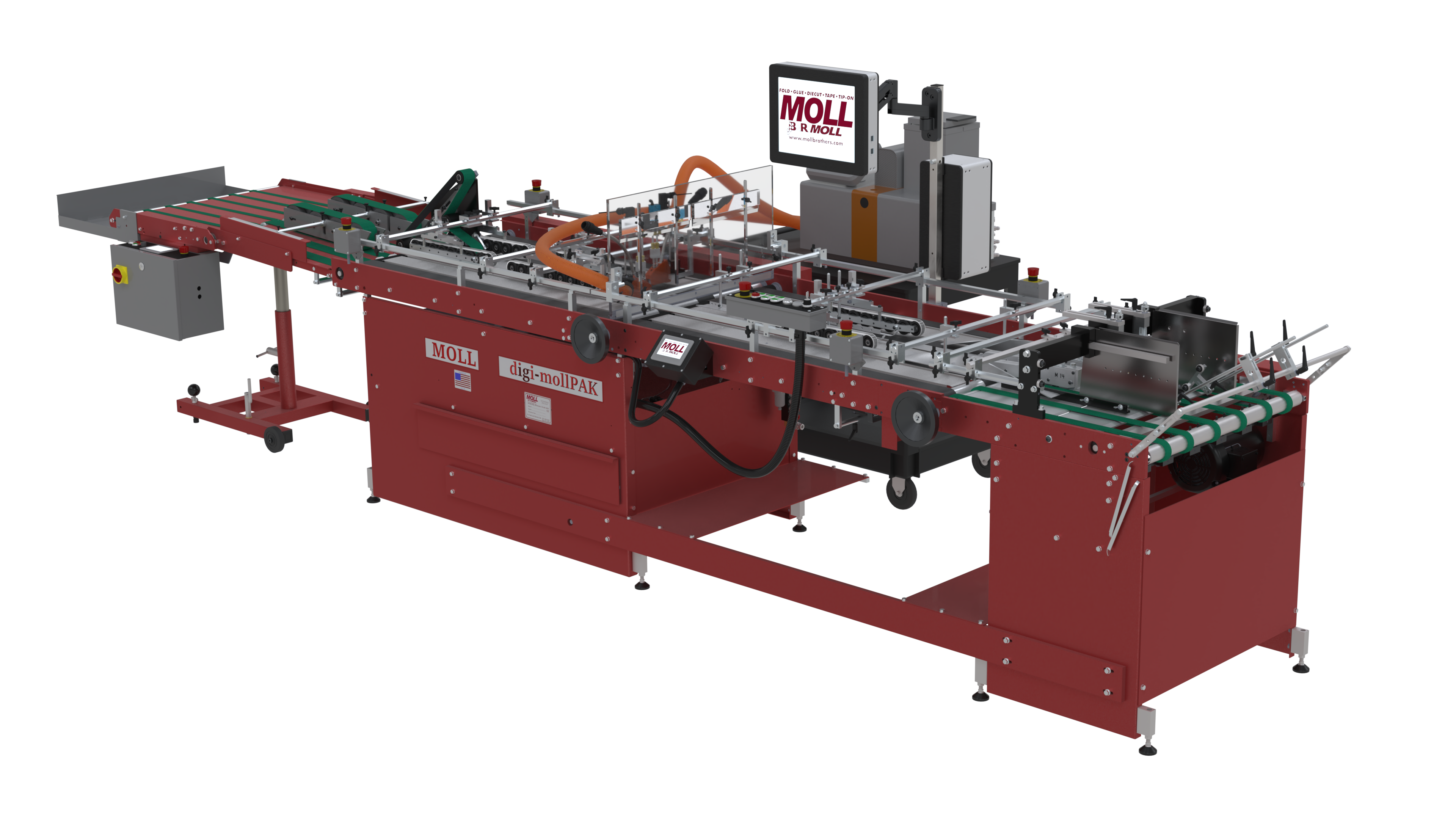The B&R Moll digi-mollPAK System In-line folder/gluer is the most versatile machines for digital and commercial printers designed to offer fast, flexible performance in a compact machine that delivers complex packaging jobs at an affordable price. The digi-mollPAK line is ideally suited for producing straight-line boxes, room key holders, table tents, sleeves, CD wallets, computer software cartons and presentation folders. An optional kit for producing auto-lock bottom boxes is available. The friction Feeder section offers continuous feed for not just regular shaped product, but irregular as well. Moll’s new etched rails make it incredibly easy to change jobs over multiple time a day without sacrificing run speeds.