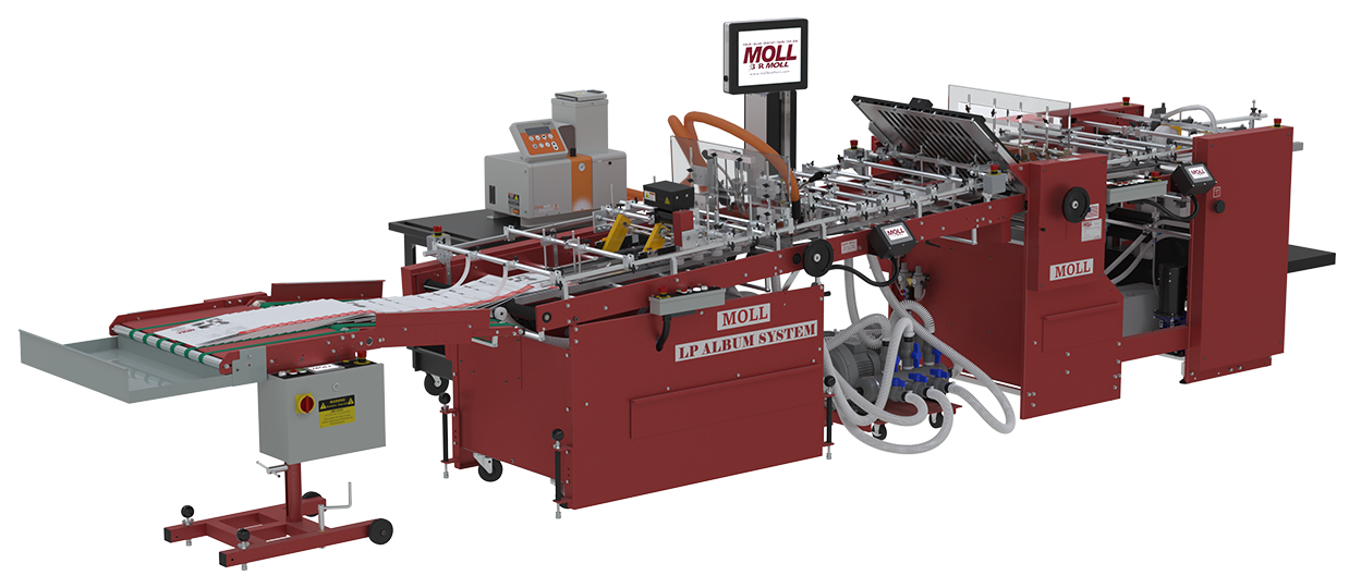 Moll’s new LP Record Album Folding System’s ability to handle lightweight inner sleeve (with or without holes) to capacity LP Albums allows the machine to stand in its own class. The quick change-over time makes it flexible enough to handle a wide variety of jobs. It can be configured to produce a range of finished pieces, gate fold albums, CD/record sleeves, digipacks, capacity spine flat side LP’s, and three sided capacity LPS. Designed as an all belt-driven in-line system, it features a built-in during folding, and the tipper fold plate features an anti-marking roller accommodating stocks up to 28pt+.